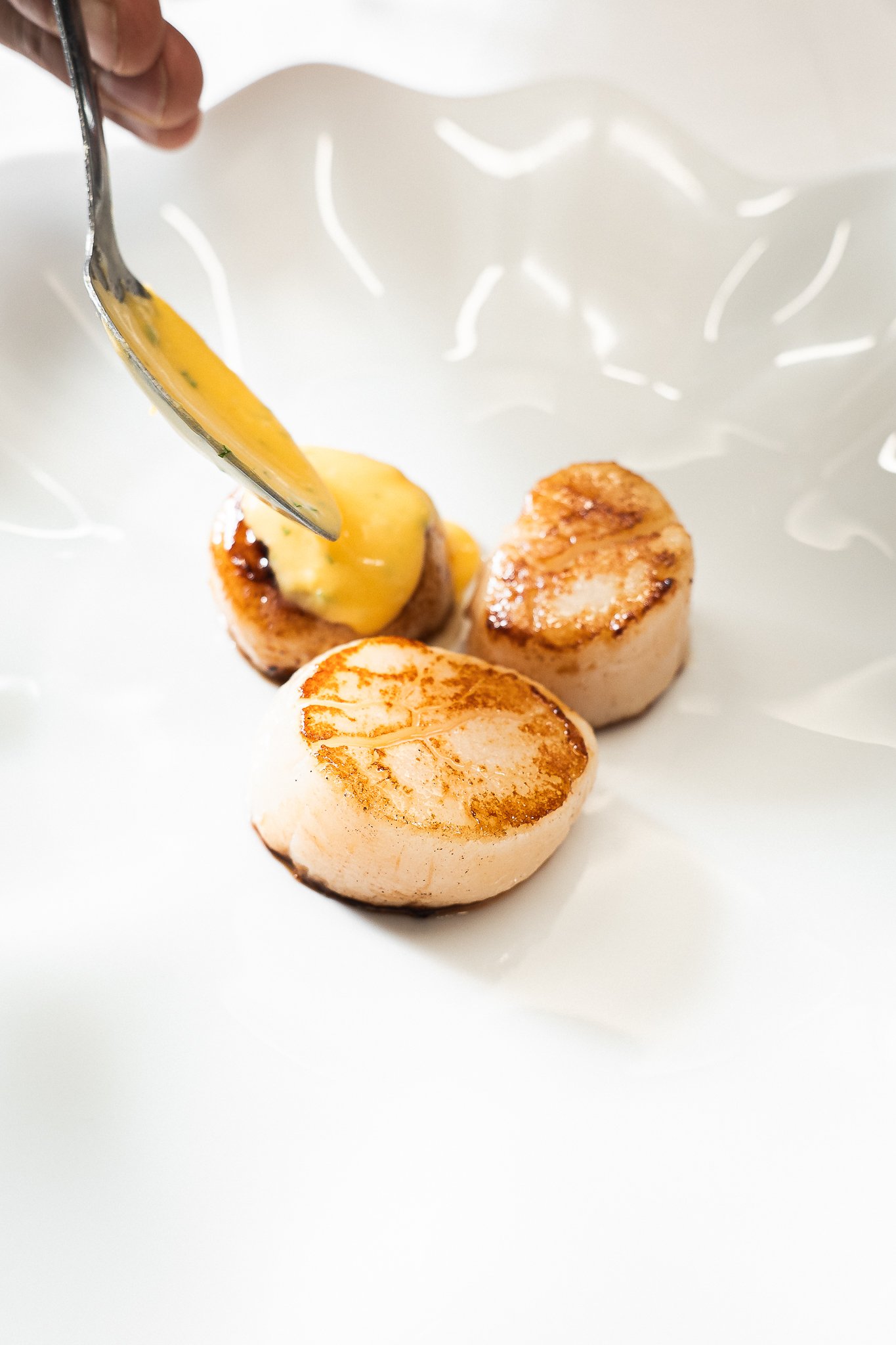 Vieira amb coulis de garoines, coliflor noisette i cansalada “Maldonado”