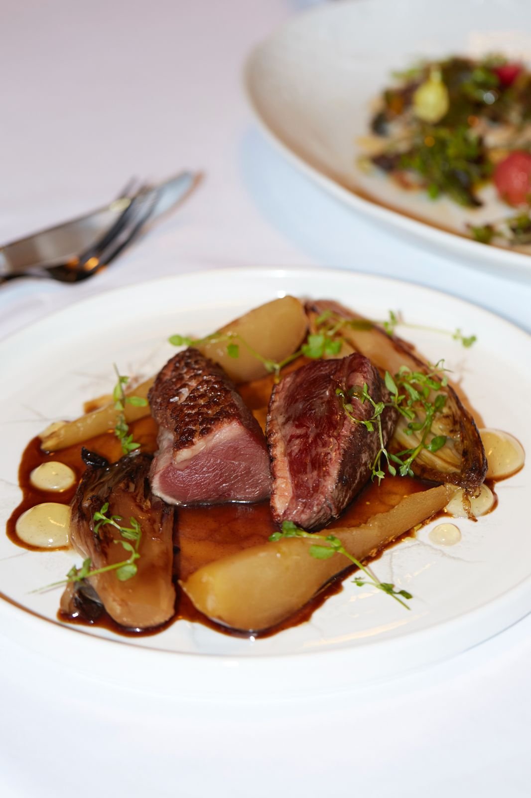 Magret de pato con jus de cassis peras al Calvados y endivia braseada