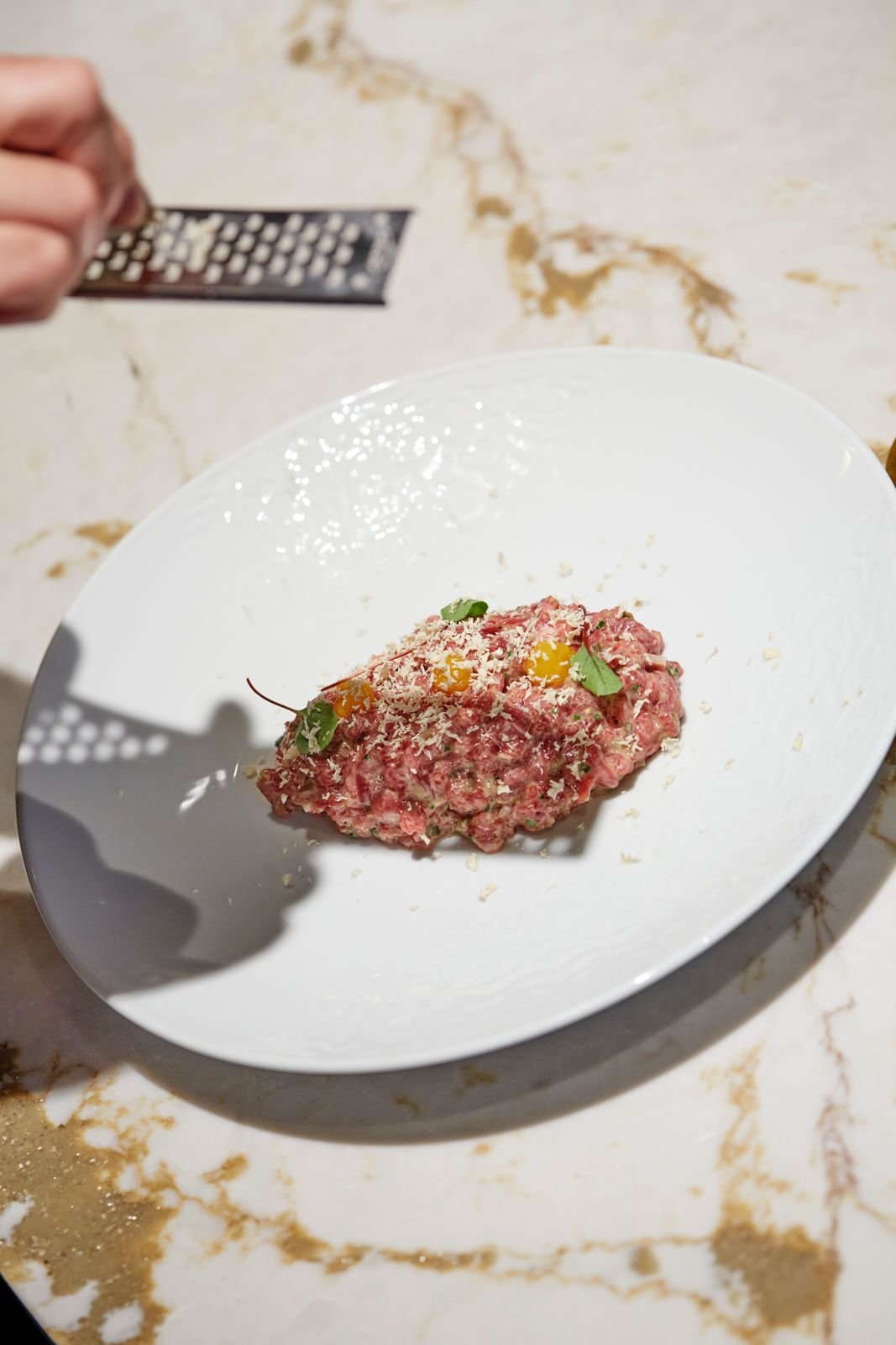 Steak Tartar de “picanha dry aged”, whisky single Malt, yema confitada y nieve de foie
